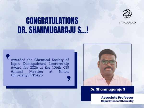 Dr. Shanmugaraju S, Associate professor, Department of Chemistry has been awarded the Chemical Society of Japan Distinguished Lectureship Award for 2026 at the 106th CSJ Annual Meeting at Nihon University in Tokyo, in recognition of his significant contributions to analytical chemistry.