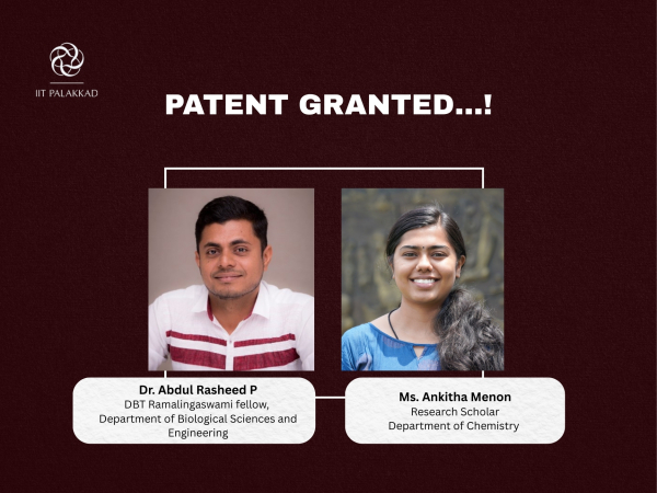 Dr. Abdul Rasheed P, DBT Ramalingaswami fellow, Department of Biological Sciences and Engineering, and Ms. Ankitha Menon, Research Scholar, Department of Chemistry has been granted Patent for their work on ‘A Carbon Yarn Based Conducting Wearable Patch Sensor For Neurotransmitter Monitoring’.